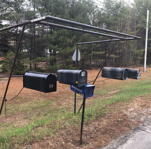 With an average 90-110 inches of snow per year, western and northern Maine should be a graveyard for mailboxes taken down by plows. Instead, it’s fertile ground for simple yet ingenious devices constructed to foil a fast-moving blade. My favorites are the portable mailbox mounts, which homeowners carry, push, or roll away from the roadside in advance of a storm. In Franklin and Aroostook counties, you'll find them mounted to tire rims, lawnmowers, wagons, sleds, skis, and wooden horses. Variations on the cantilever post are also common: a tall post is set well back from the road, and from it, a long sturdy branch or metal pole extends the mailbox over snowbanks. And sometimes a mailbox is affixed to something so formidable, like a washing machine or oil tank, that plow drivers have no choice but to give wide berth.